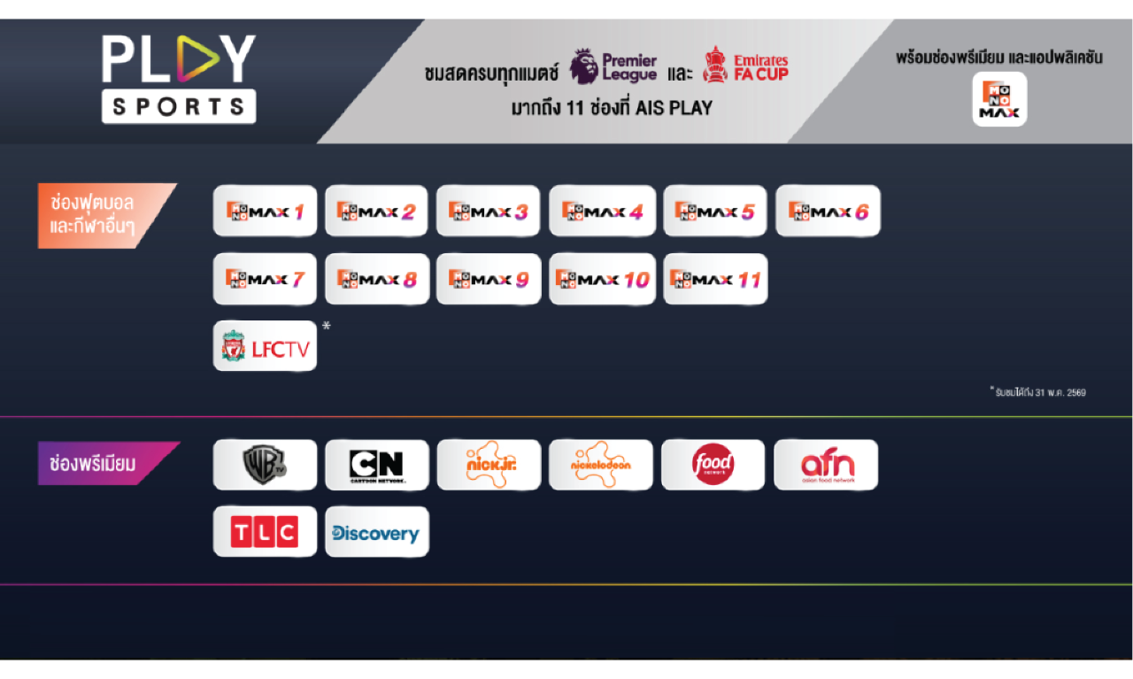 • ผู้ใช้บริการสามารถเลือกรับชมช่องรายการพรีเมียร์ลีก และเอฟเอ คัพ จาก Monomax Standard ผ่านแอปพลิเคชัน AIS PLAY หรือ MONOMAX อย่างใดอย่างหนึ่งเท่านั้นในแต่ละครั้ง โดยไม่สามารถใช้งานทั้งสองแอปพลิเคชันพร้อมกันได้