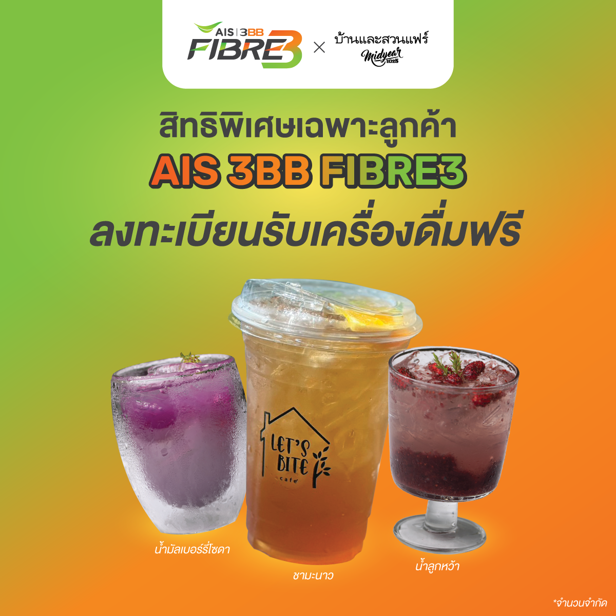 สิทธิพิเศษเฉพาะลูกค้า AIS 3BB Fibre3! มางาน บ้านและสวนแฟร์ เพียงแสดงตัวเป็นลูกค้า AIS 3BB Fibre3 และ ลงทะเบียนที่บูธ รับฟรี! เครื่องดื่มเย็นชื่นใจ 1 แก้ว จากร้านดังในโซน 🍇 ร้าน Little Tree บริเวณ โซน Home