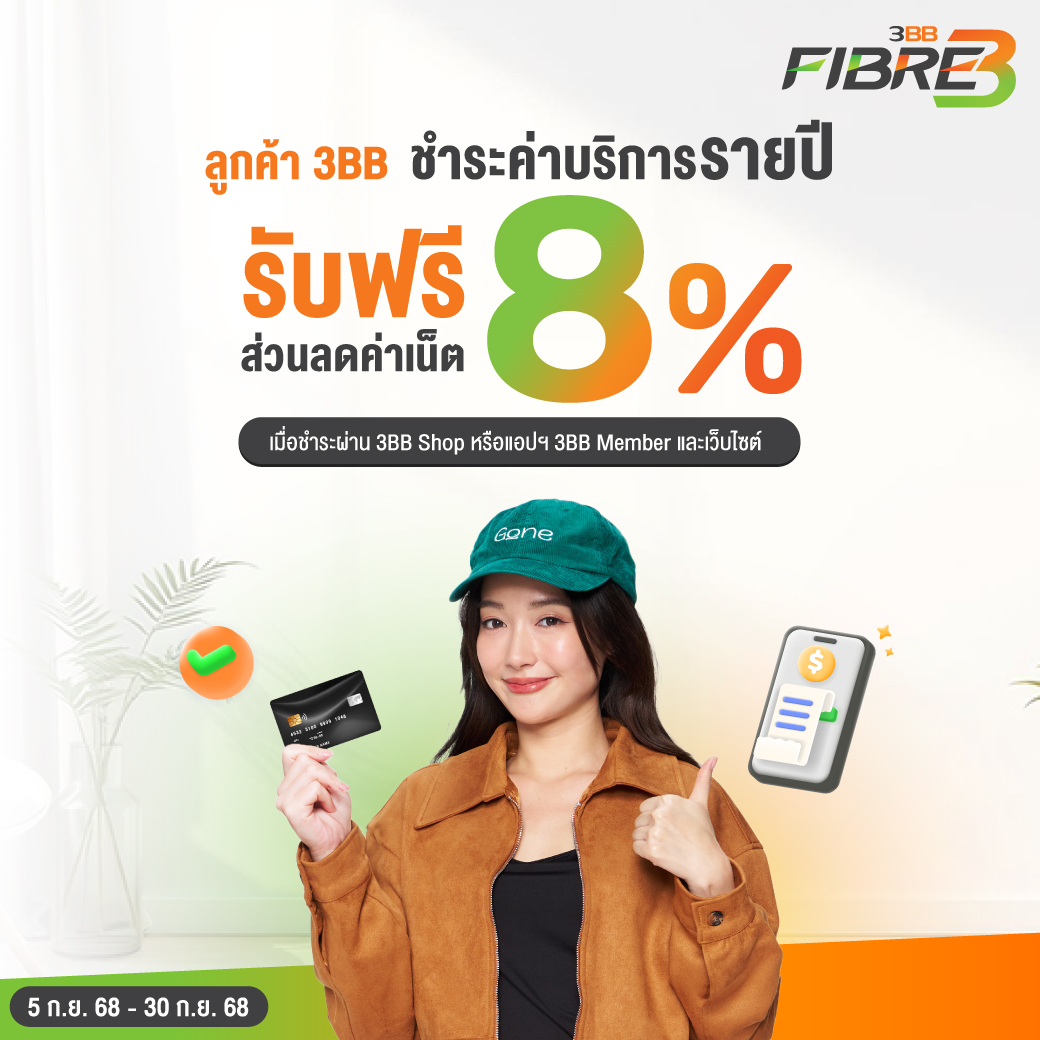 ลูกค้า 3BB ชำระค่าบริการรายปีรับฟรี ส่วนลด 8%