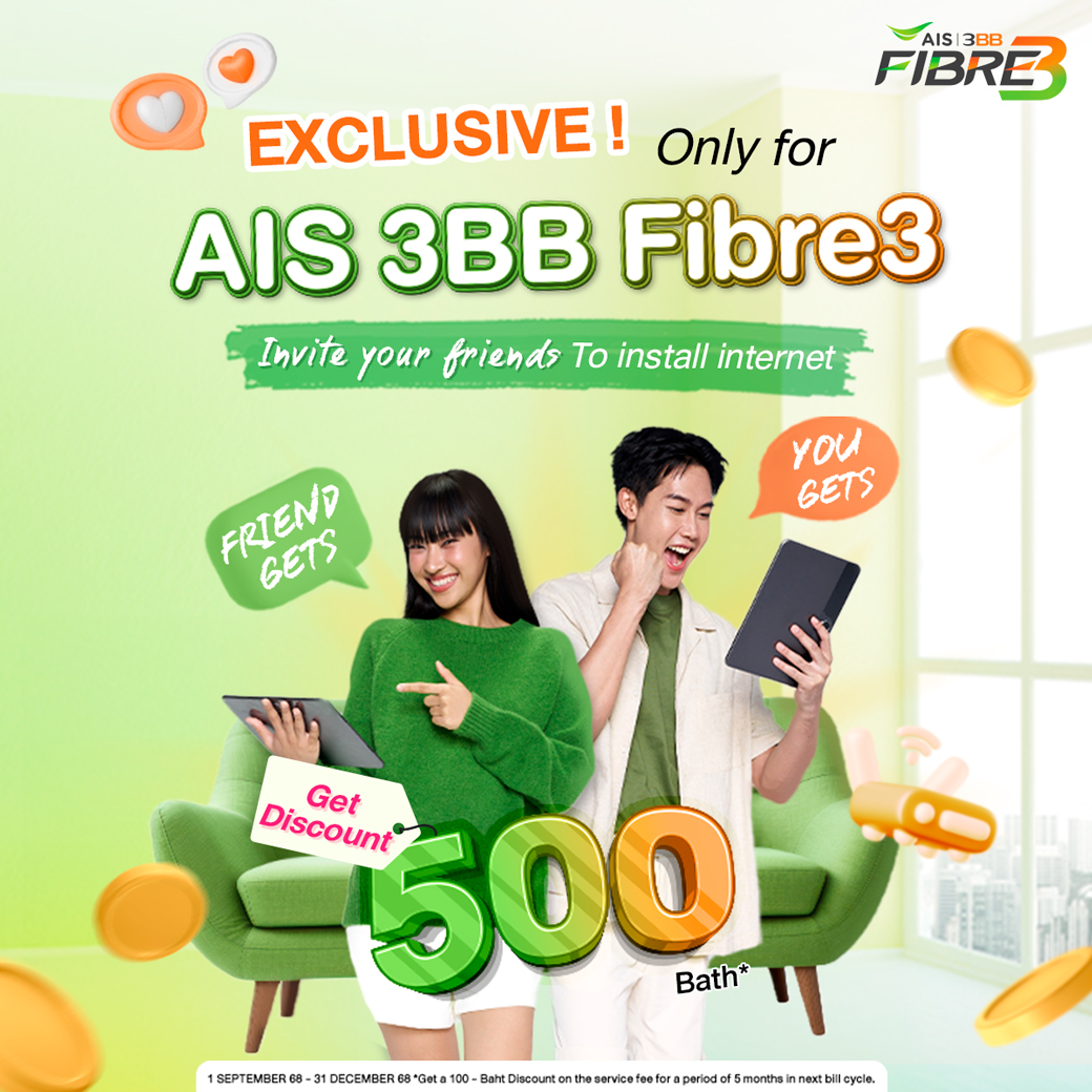 เพื่อนได้เราได้ วินวินทั้งคู่กับโปรโมชั่นพิเศษเฉพาะลูกค้า 3BB FIBRE3 เท่านั้นเพียง “ชวนเพื่อน” ติดตั้งอินเตอร์เน็ตกับ 3BB Fibre3 รับส่วนลดพิเศษ 500 บาท เพื่อใช้เป็นส่วนลดในบิลค่าบริการครั้งถัดไป