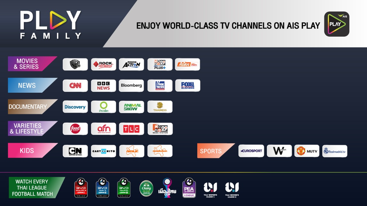 Free! AIS PLAYBOX with a free! On-top PLAY FAMILY package for movies, series, concerts and varieties TV progreams. And 10 world-class channels for 24 months period (from 119 THB./month).