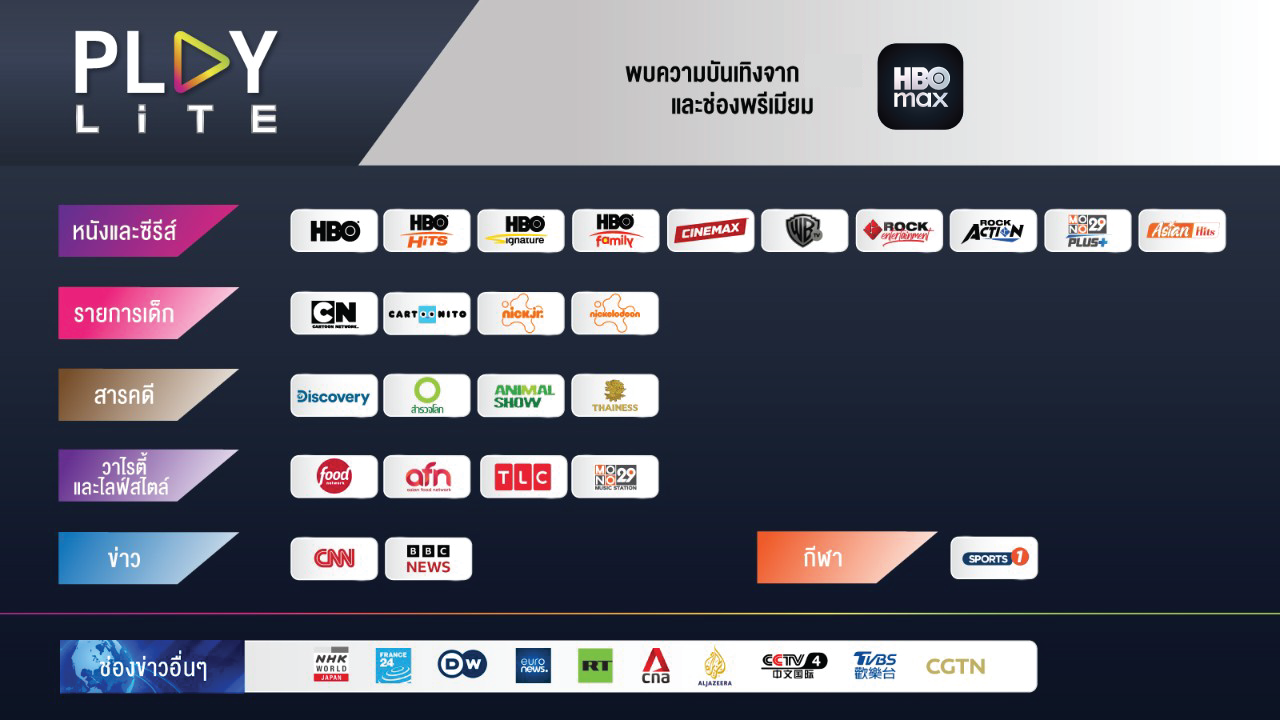 - รับสิทธิ์ชมแอปพลิเคชัน HBO Max จากแพ็กเกจ PLAY LITE โดยไม่มีค่าใช้จ่ายเพิ่มเติม